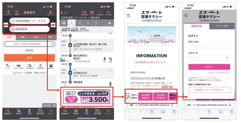 本連携によって、ジョルダンの乗換案内アプリで「スマート空港タクシー」のサービスエリア内(山口宇部空港・山口市内)を検索した際、検索結果画面にバナーが表⽰され、「スマート空港タクシー」のwebアプリに遷移し予約を行うことができます。(例:東京都内から山口市内を検索した場合、山口宇部空港から市内中心部までのラストワンマイルで「スマート空港タクシー」の利用を提案)