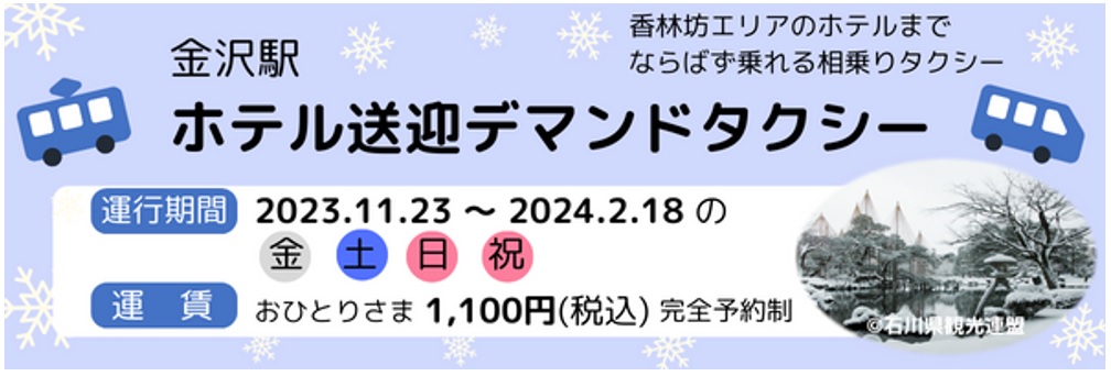 当日の9時までにご予約いただくことで、バスやタクシー乗り場に並ぶことなく、金沢駅から香林坊エリアのホテルにお送りする便利な相乗りタクシーです。