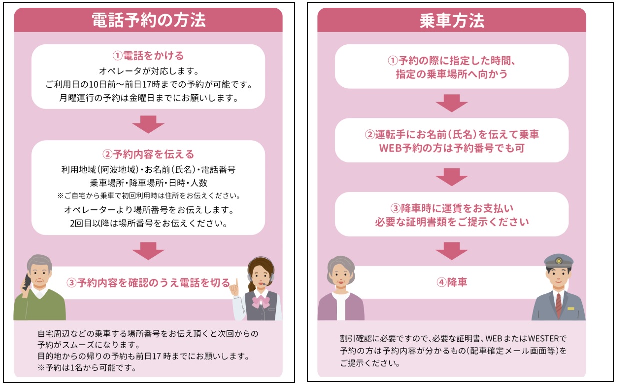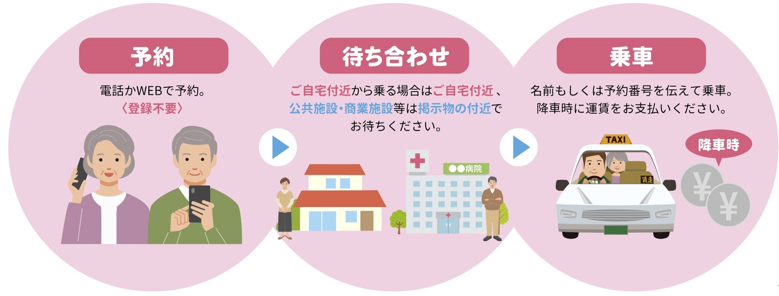 事前にご予約いただくことで、ご自宅付近の乗車場所から支所・出張所、スーパー、病院等の公共施設、商業施設、医療施設等までお送りする乗合交通です。