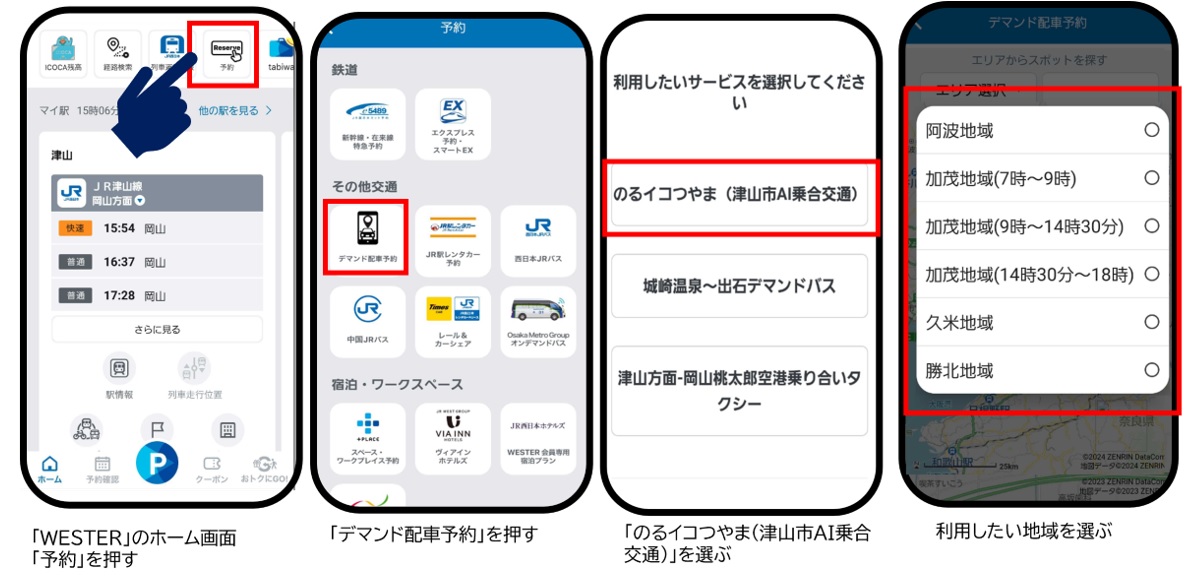 ・「のるイコつやま(津山市AI乗合交通)」を選択し、WESTERからのご予約方法と同様に操作してください。